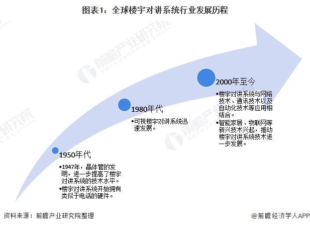 从全球楼宇对讲系统发展历程来看,早期楼宇对讲以电子管的形式存在,用于传递声音。1950年代左右,楼宇对讲系统开始拥有类似于电话的硬件,访客和居民可以通过按下或按住直接通过对讲机彼此交谈。