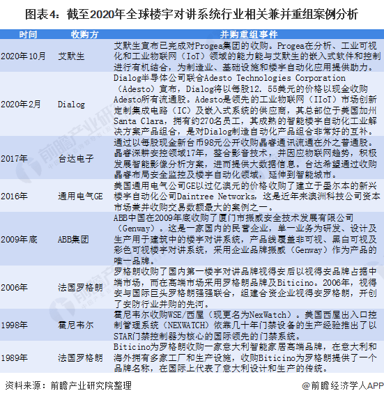 全球楼宇智能化及楼宇对讲系统行业兼并重组主要为横向兼并,即兼并同类业务的企业,拓展公司该业务的生产能力,增强业务竞争力。2010年之前,国际楼宇对讲系统主要企业并购活动较为频繁,如ABB公司收购Genway,主要目的是希望能扩大高端及中端的楼宇对讲市场份额。
